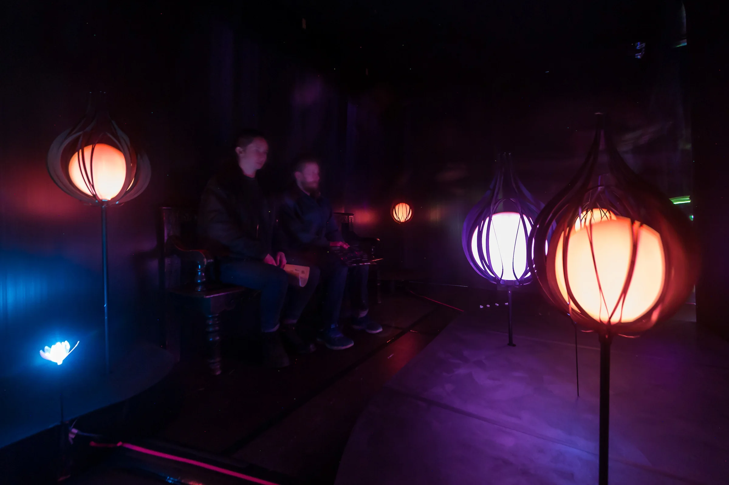 Studio Fractal's installation North Court & Malcom Rose’s workshop combining light, UV, video projection, colour, craft and sound.